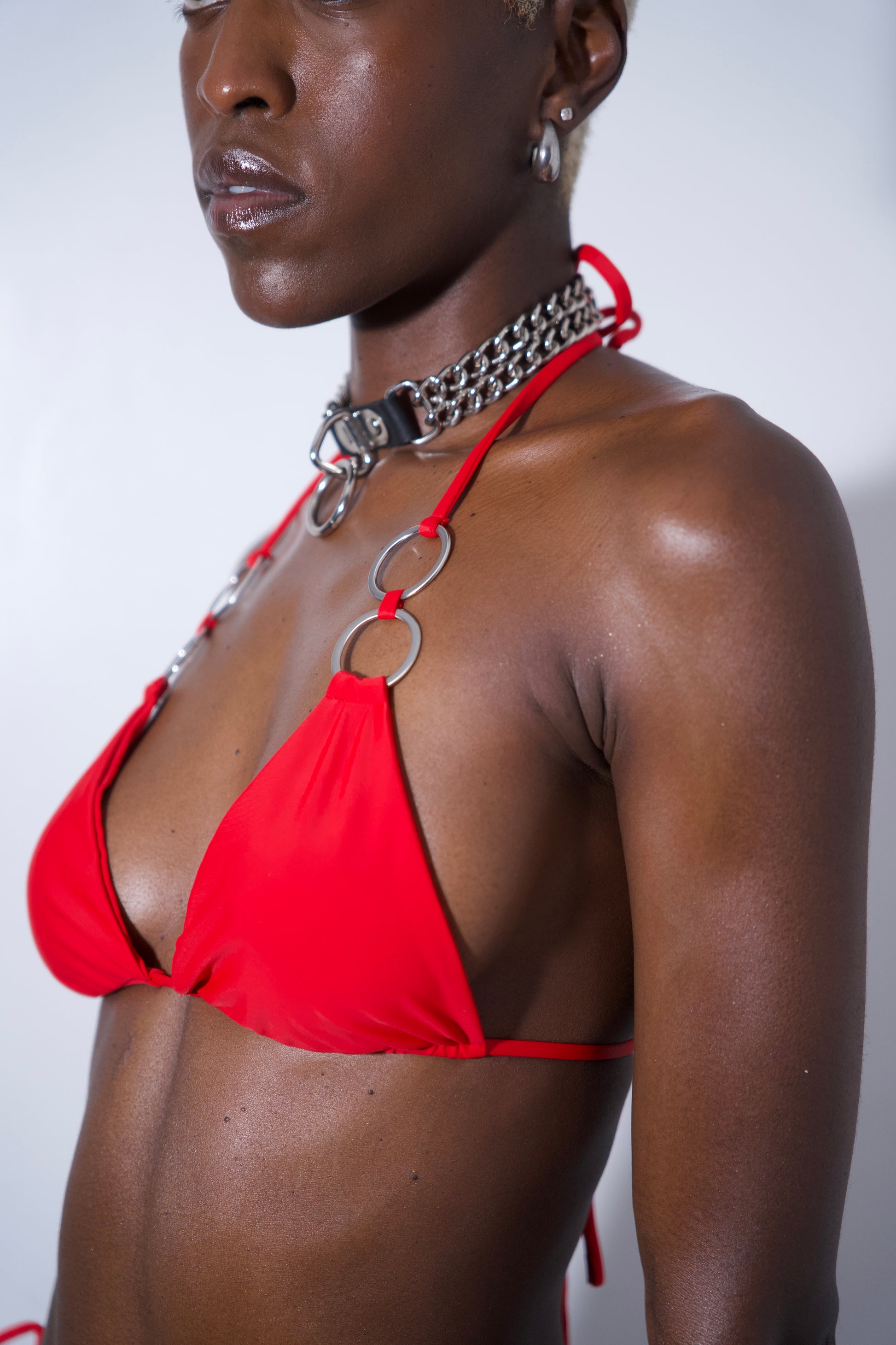 Halter neck bikini top with double silver rings hardware. Adjustable shoulder and back straps.